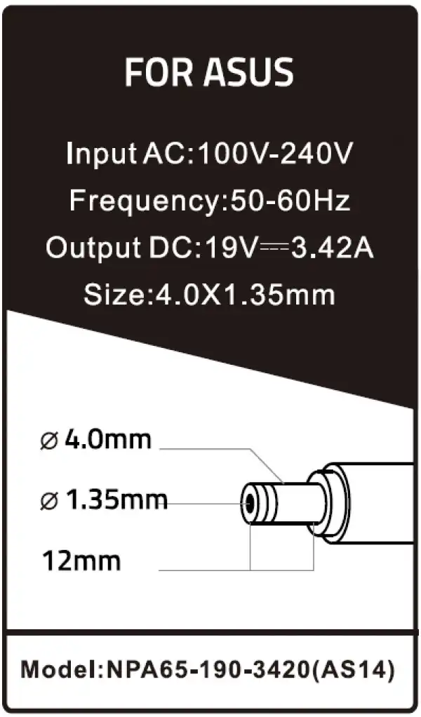 Odgovara modelima punjača: PA-1650-66 Asus, ADP-65WH AB Asus, ADP-65WH BB Asus, ADP-65JH BB Asus, ADP-65GD B Asus, PA-1650-78 Asus, 0A001-00031300 Asus, 0A001-00040700 Asus, 0A001-00044500 Asus, 0A001-00044600 Asus, 0A001-00044800 Asus, 0A001-00046500 Asus, 0A001-00048600 Asus, 0A001-00049200 Asus, 0A001-00049700 Asus, 0A001-00230800 Asus, 0A001-00232100 Asus, 0A001-00232500 Asus, 0A001-00233100 Asus, 0A001-00233300 Asus, 0A001-00233800 Asus, 0A001-00235000 Asus, 0A001-00234800 Asus, 0A001-00235800 Asus, 0A001-00236300 Asus, 0A001-00236400 Asus, 0A001-00237800 Asus, 0A001-00237900 Asus, 0A001-00238600 Asus, 0A001-00238700 Asus, 0A001-00441200 Asus, 0A001-00441700 Asus, 0A001-00442900 Asus, 90-XB3NN0PW00040Y Asus, 0A001-00040700 Asus, ADP-65AW A Asus, 884840046516 Asus