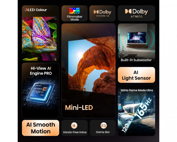 - HLG, Filmmaker Mode, AI 4K Upscaler, Game Bar, AI Sports Mode, AI Light Sensor, AI Smooth Motion, Hi-View Engine (4K), 165Hz Game Mode Ultra, Total HDR Solution