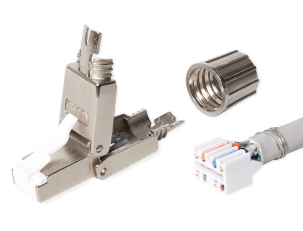 RJ-45 konektor STP kat. 6a – fully shielded (oklopljen) 8P8C, za direktnu terminaciju bez alata na UTP/STP kabl patch (licnasti) ili punog preseka, 500MHz – 10GbE, sa metalnom navlakom koja fiksira kabl. Lako se spaja bez alata. Direktan završetak na Cat.6a, Cat. 6, kablovi brza i laka instalacija bez alata povezivanje IP kamera i bežičnih uređaja bez potrebe za korišcenjem utičnica i patch kablova potreban prostor za ugradnju 50 mm omogucava prenos svih brzih protokola uključujuci 10GBASE-T unutar sistema Cat. 6A garantuje propusni opseg od 500 MHz unutar sistema Cat.6A savršeno zašticen od preslušavanja vanzemaljaca i elektromagnetnih smetnji