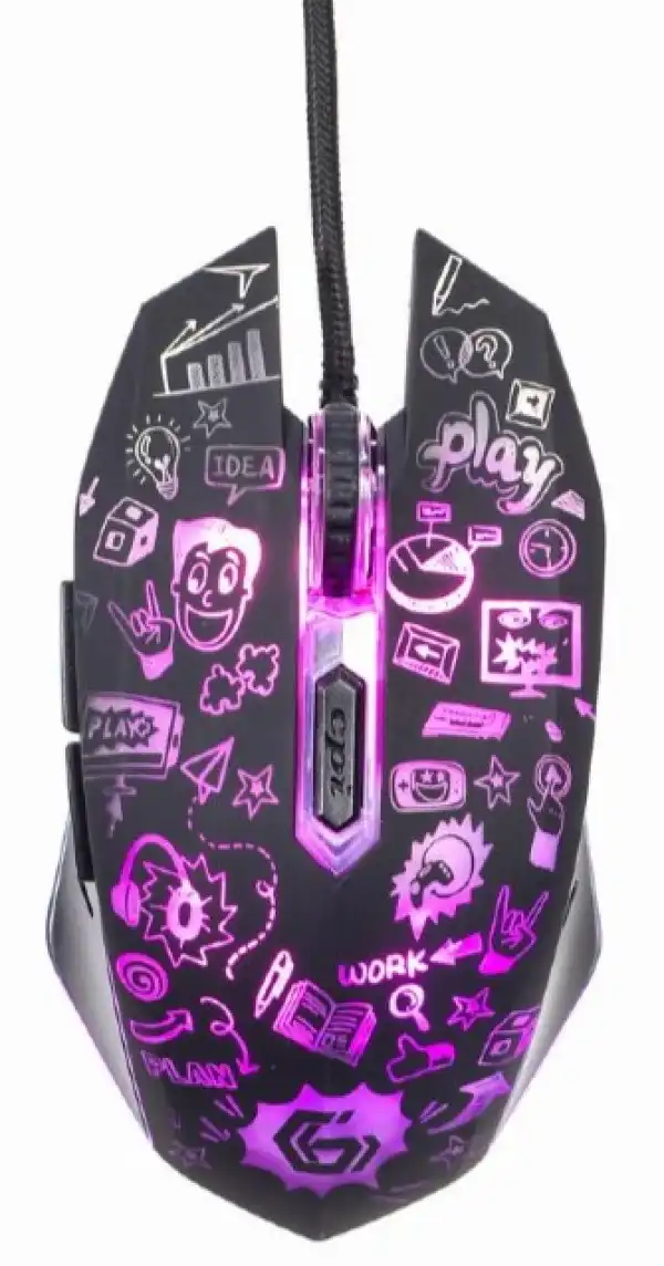 6-button optical mouse with cartoon style graphic design Color changing LED backlight CPI button for quick resolution changes (1200 - 3600 DPI) Next/Previous buttons for faster Internet browsing Works on most surfaces Specifications Interface: USB 2.0 Optical resolution: 1200-1800-2400-3600 DPI Power consumption: 5 V DC up to 5 mA Cable length: 1.5 m Dimensions: 130 x 74 x 36 mm Net weight: 124 g System requirements Windows 7/8/10/11 Free USB port