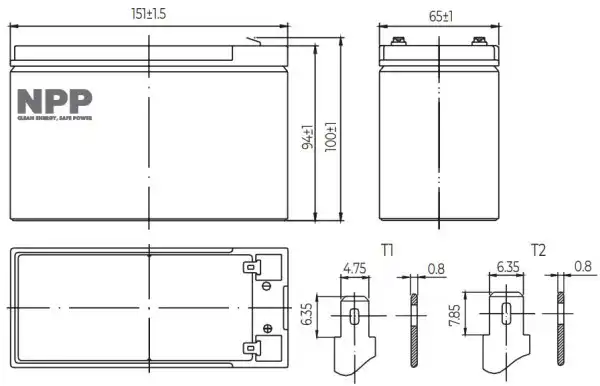 Serija baterija opšte namene NPP Power dizajnirana je sa najsavremenijom AGM (upijajucom staklenom prostirkom) tehnologijom, plocama visokih performansi i elektrolitom. Sa odlicnom vrednošcu i karakteristikama, ovaj asortiman je pogodan za sve primene opšte namene. -Stabilan kvalitet i visoka pouzdanost -Dug radni vek -Rad bez održavanja -Rešetke za teške uslove rada -Nisko samopražnjenje Primena za: Kontrolni sistemi/Elektricne igracke/Svetiljka za hitne slucajeve/Elektricni alati/Alarmni sistemi/Sistemi svetla za hitne slucajeve/Napajanje u stanju pripravnosti/UPS/Napajanje/Telekomunikacioni sistem/Rezervno napajanje protivpožarne opreme/Železnicki sistem/Elektronske stanice.. Nominalni napon: 12V (6 celija po jedinici) Nominalni kapacitet pri brzini od: 20 sati/10,5V (25°C) : 7,5Ah 10 sati/10,5V (25°C) : 7Ah 5 sati/10,5V (25°C) : 6,6Ah Tip terminala: T1/T2 Obrtni moment: N/A Pribl. unutrašnji otpor (25°C): 30 mO Dimenzije: Dužina: 151±1.5mm (5.94inch) Širina: 65±1mm (2.56inch) Visina: 94±1mm (3.70inch) Ukupna visina: 100±1mm (3.94inch) Design Life (stand-by): JIS na 25°C 5 godina Eurobat na 20°C 3-5 godina Težina: 2,07 kg (4,57 lbs) ±4% Nominalna radna temperatura 25±3°C (77°F±5) Operativna temperatura: -Pražnjenje -15°C~50°C (5°F~122°F) -Punjenje -10°C~50°C (14°F~122°F) -Skladištenje -20°C~50°C (-4°F~122°F) Napon punjenja float na 25°C 13.6V~13.8V Napon ciklickog punjenja na 25°C 14,5V~15,0V Temperatura kompenzacija: -Plutajuce punjenje -18 mV/°C/blok -Ciklusno punjenje -30 mV/°C/blok Max. struja punjenja (A) 2.7A Max. struja pražnjenja za 5 sekundi 115A Stopa samopražnjenja (25°C) =3%/mesecno Kontejner za baterije ABS UL94-HB V-0 opciono Pozitivna ploca: Olovni dioksid Negativna ploca: Olovo Kontejner: ABS (V-0 opt.) Separator: AGM Elektrolit: Sumporna kiselina Sigurnosni ventil: Guma Terminal: Bakar