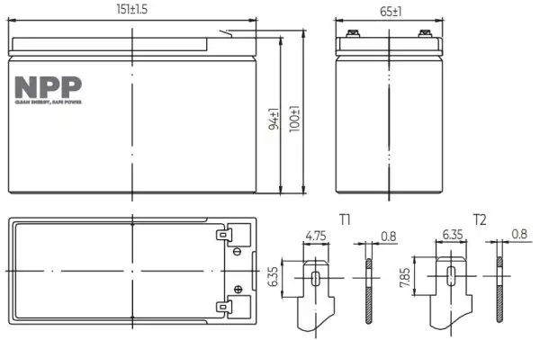NPP NP12V-7Ah, AGM BATTERY, C20=7AH, T1, 151x65x94x100, 1,97KG, BLACK