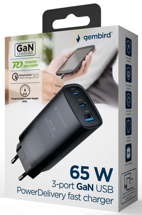 TA-UC-PDQC65-01-BK Gembird 3-port 65W GaN USB PowerDelivery fast charger, black