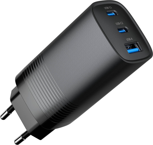 3-portni 65W GaN USB PoverDelivery brzi punjac, crni -65W snage za vas pametni telefon ili laptop. -Port Tipe-C ili standardni USB port za brzo punjenje vecine pametnih telefona. -Podrzava i USB PD i QC 3.0 protokol brzog punjenja. -GaN tehnologija omogucava kompaktniji energetski efikasan dizajn -Portovi tipa C podrzavaju 65W PD, port tipa A podrzavaju 27W QC 3.0 -Inteligentna zastita od prekomerne struje, prenapona, kratkog spoja i pregrevanja Input voltage: 100 V - 240 V ~, up to 1.5 A (Max. 360 W) Standby power consumption: <0.3W USB-C1/C2 output: 5 V /3 A, 9 V / 3 A, 12 V / 3 A, 15 V / 3 A, 20 V / 3.25 A USB-A output: 5 V / 3 A, 9 V / 3 A, 12 V / 2.25 A USB-C1+USB-C2 output: 45 W (5 V / 3 A, 9 V / 3 A, 12 V / 3 A, 15 V / 3 A, 20 V / 2.25 A) +20 W (5 V / 3 A, 9 V / 2.22 A, 12 V / 1.67 A, 15V / 1.33 A, 20 V / 1 A), 65 W total max. USB-C1+USB-A: 45 W (5 V / 3 A, 9 V / 3 A ,12 V / 3 A, 15 V / 3 A, 20 V / 2.25 A) +18 W (5 V / 3 A, 9 V / 2 A, 12 V / 1.5 A), 63 W total max. USB-C2+USB-A: 5V / 4.8 A, 24 W max. USB-C1+(USB-C2+USB-A): 45 W (5 V / 3 A, 9 V / 3 A, 12 V / 3 A, 15 V / 3 A, 20 V / 2.25 A) + 15 W (5 V / 3 A), 60 W total max. Output protection: short circuit, over-voltage, overcharge, overheat Dimensions: 39 mm x 106 mm x 34 mm Net weight: 124 g